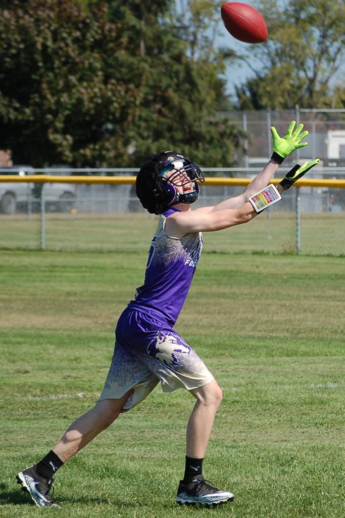Junior wide receiver Ryan Porter stretches out to catch a pass over the top during an early practice session. Porter and fellow junior Michael Young will be expected to help fill the void of graduated WR Kyler Rollness, who caught 53 passes and 11 touchdowns in 2018. Sequim Gazette photo by Conor Dowley