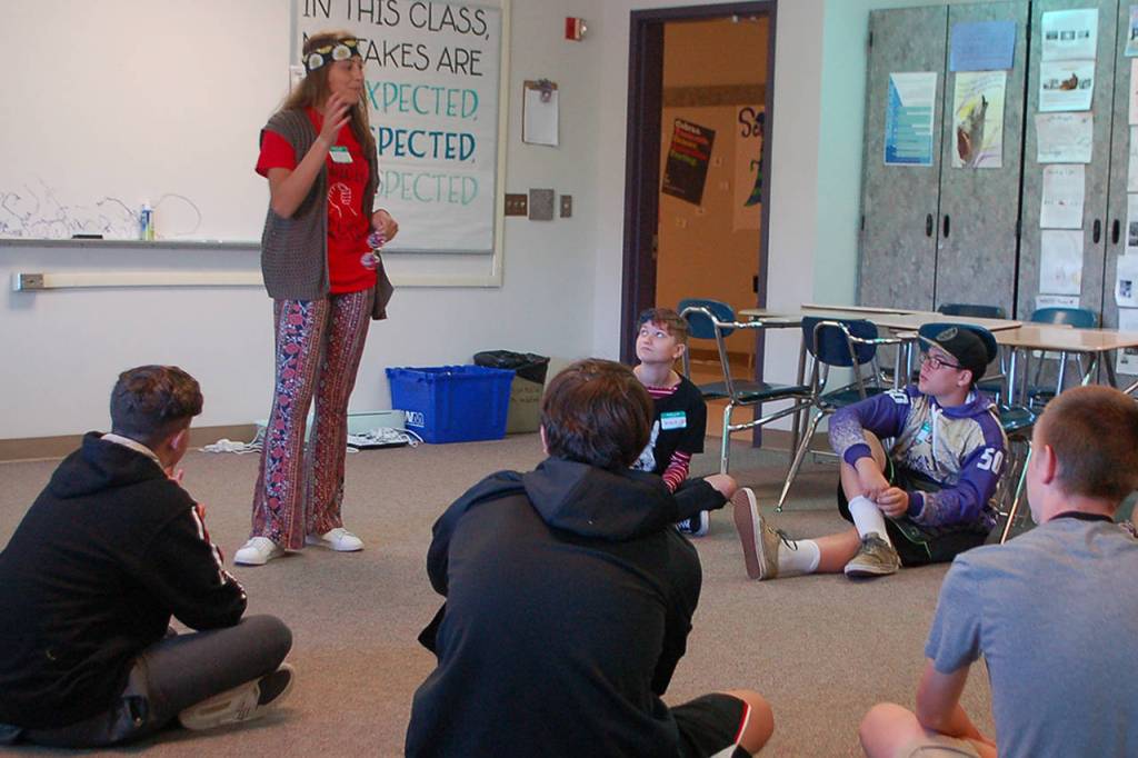 Above, Jessica Dietzman, standing, talks with a group of incoming Sequim High School freshmen at a Link Crew orientation on Sept. 3. Dietzman and the other Link Leaders are overseen by SHS teacher Sean O’Mera and help ease the transition into high school for all the incoming freshmen, with pairs of older students working with small groups of 8-10 freshmen.