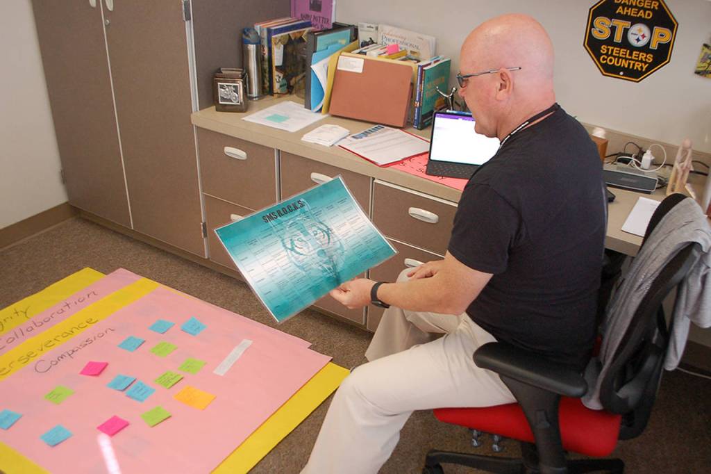 New Sequim Middle School principal Mark Harris works on a series of posters exemplifying the five core values he’s going to be emphasizing at the school this year: respect, integrity, collaboration, perseverance and compassion. “These are things that our students need to learn more about at this stage when they’re really starting to want to become adults,” Harris said. “We want to give them the best examples and reinforcements of these ideas that we can.” Sequim Gazette photo by Conor Dowley
