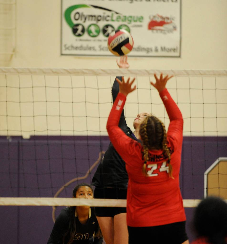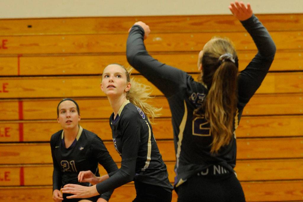 As teammate Kiana Robideau (31) looks on, Sequim freshman Kendall Hastings looks for a big hit as Port Townsend senior Tori Minnihan (24) vies for a block in the opening match of Sequim’s volleyball jamboree on Sept. 9. Sequim swept the Redhawks in three games (see more photos from the match at cmg-northwest2.go-vip.net/sequimgazette). The jamboree saw round-robin play between Sequim, Port Angeles and Port Townsend. The Wolves open Olympic League play at Port Angeles on Sept. 12 and host Bremerton on Sept. 17. Sequim Gazette photo by Michael Dashiell