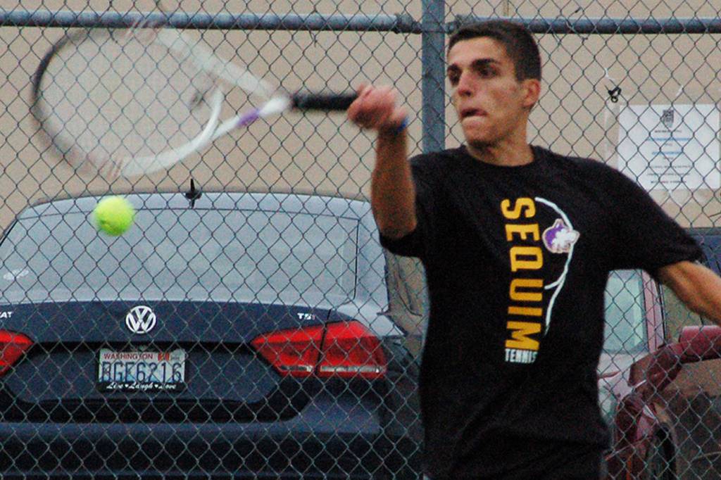 Nico Zingaro returns a serve in the second set of his match against North Kitsap’s Chris Schuchart on Sept. 25, which he would win 6-2 to win the match. Zingaro was Sequim’s only undefeated player on the week, not dropping a single set in three matches. Sequim Gazette photo by Conor Dowley