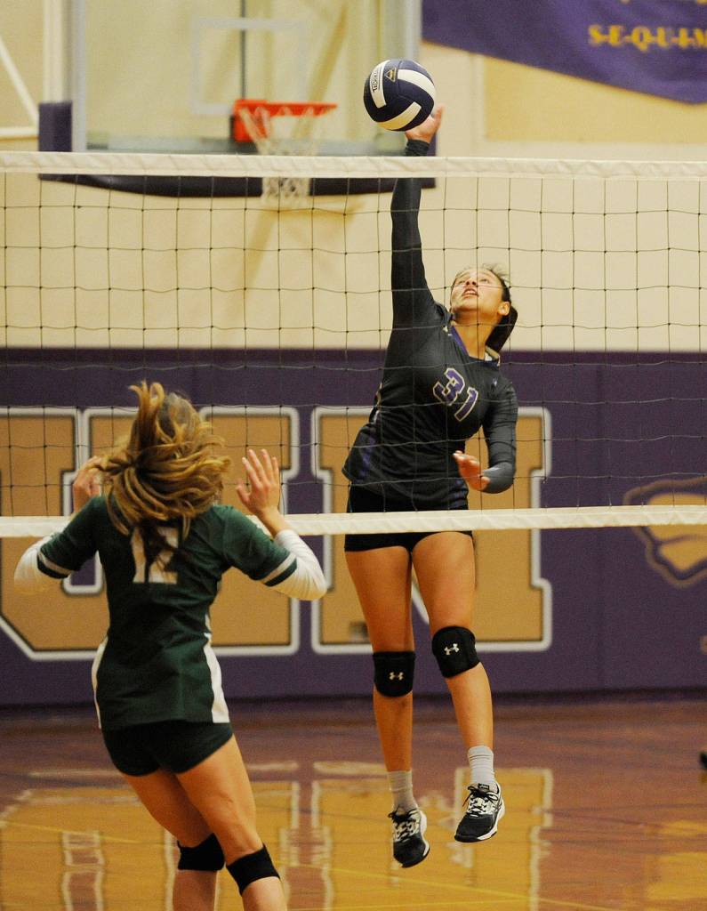 Jordan Hegtvedt led Sequim with an 11-point serving run in game four leading to another 25-15 Sequim win, but the Wolves “shut down” in game five, Webber Heilman said.