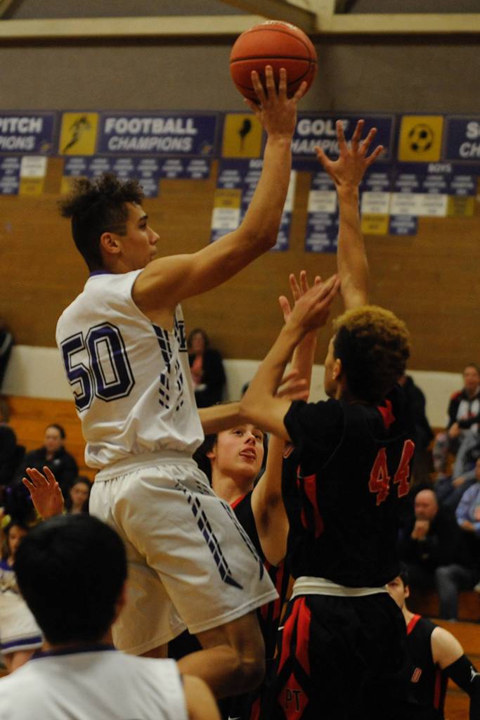 Erik Christiansen, pictured shooting a three pointer against the Neah Bay Reds on Dec. 4, scored 28 points that night after scoring 13 during the team’s season opener against Klahowya on Dec. 2. Sequim Gazette photo by Conor Dowley