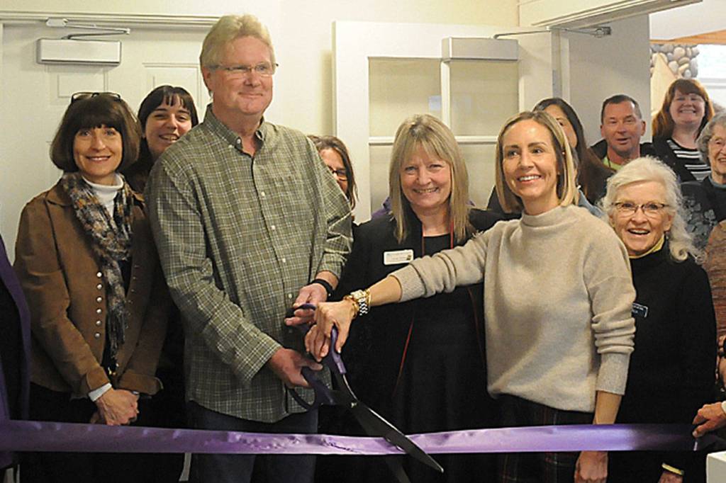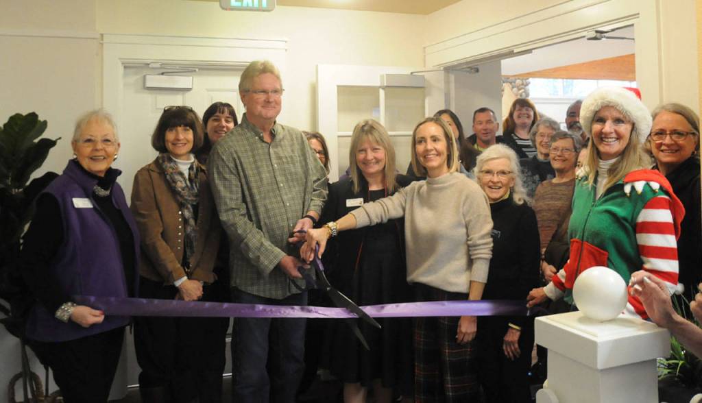 Twenty years and going strong: Staff and community members celebrate Dungeness Courte Memory Care’s 20th anniversary celebration with a party and Sequim-Dungeness Valley Chamber of Commerce ribbon-cutting on Dec. 4. Leading the ribbon-cutting are (front row, from left) Jan Orr, Rick Anderson, Linda Potter and Darah Cooney at 651 Garry Oak Drive in Sequim. Reach the business at 360-582-9309. Sequim Gazette photo by Michael Dashiell