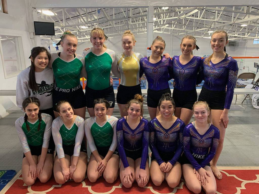 The combined Port Angeles-Sequim-Crescent prep gymnastics squad vied for top placings at the five-team Sehome Invitational on Jan. 4. Sequim’s Emma Sharp earned a pair of top-10 finishes — ninth in the vault (9.0 and 10th on the floor (8.3) — while Sequim teammate Kori Miller was 10th on the bars (6.10). Other teams competing included host Sehome (first place), Columbia River (second), Ballard (third) and Shorewood/Shorecrest. Pictured are (back row, from left) manager Mei Ying Harper-Smith, Maizie Tucker and Aiesha LaTourette of Port Angeles, Aubrie Scott of Crescent, and Ellie Turner, Emma Sharp and Gracie Sharp of Sequim, with (front row, from left) Port Angeles’ Samantha Aranda, Molly Scofield and Estrella Wasankari, and Sequim’s Lani Vig, Lesea Pfeffer and Kori Miller. Submitted photo