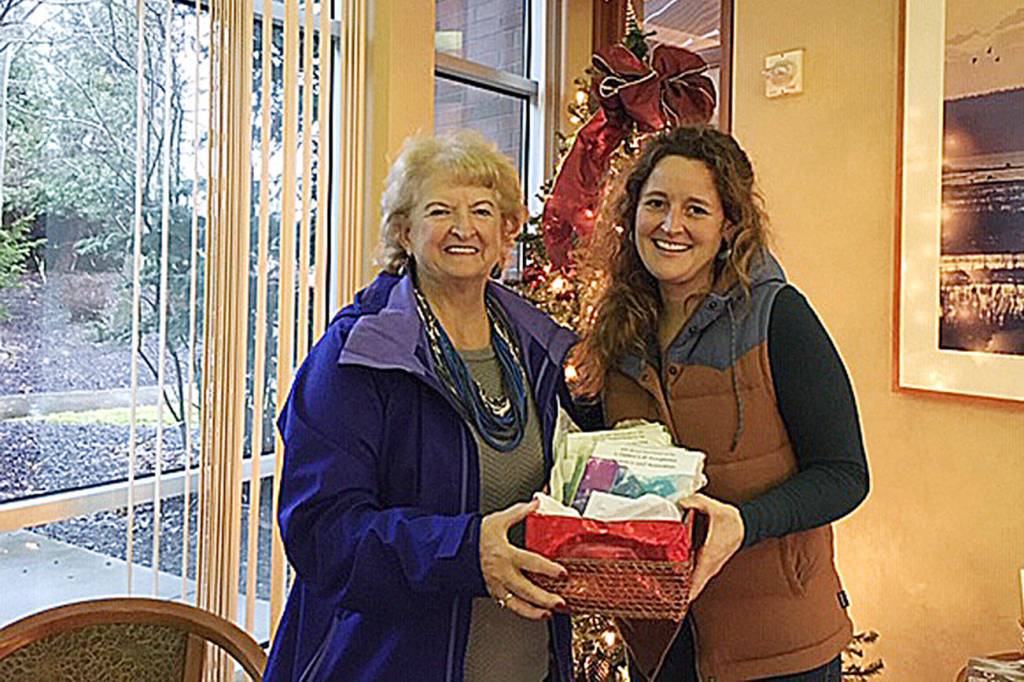 Carin Bunney, left, presents Mikel Townsley, Olympic Medical Cancer Center Patient Navigator with a donation of 40-45 hand-painted scarves from Carin Bunney on behalf of The Cedars at Dungeness Women’s Golf Association. On Dec. 13, 21 local golfers put down their clubs to celebrate the holiday season at member Bunney’s home. In addition to sharing a festive meal the group collected food and money for the Sequim Food Bank.