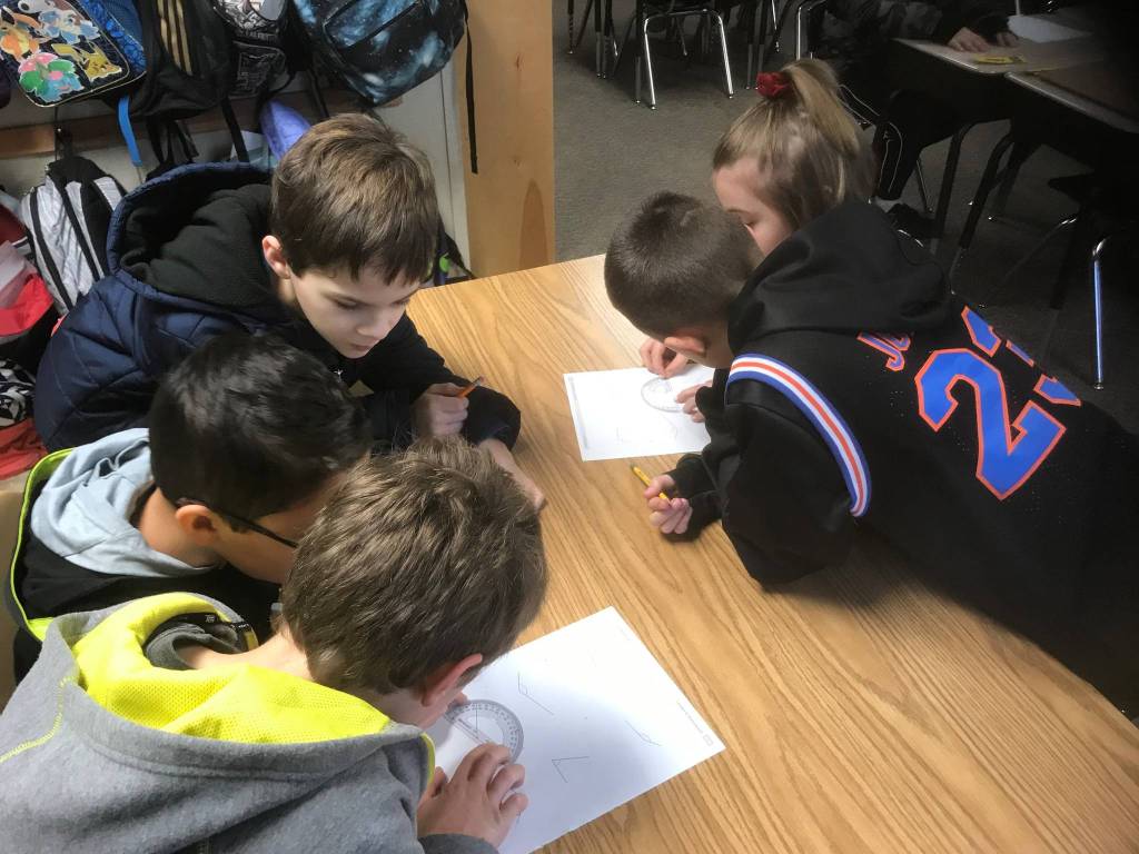 In math, Haller fourth-grade students worked on geometry concepts – lines, measuring angles, finding unknown angle measures using basic algebra, and classifying triangles and quadrilaterals based on attributes.