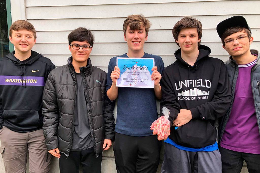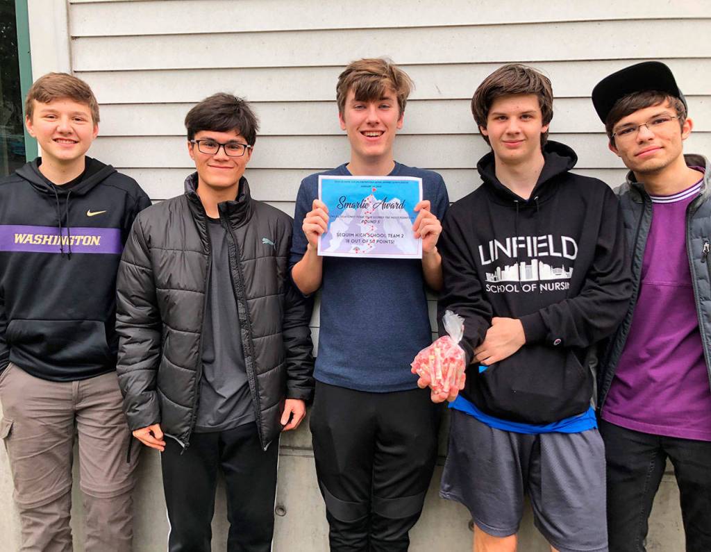 Sequim High School recently sent five teams to Fort Warden for the second Knowledge Bowl tournament of the year. The team consisting of Erik Holtrop, Calem Klinger, Sam May, Richard Meier and Ryan Schmitt received the fifth round Smarties Award, an honor awarded to the team who scores the most points during the round. They also placed third overall in the tourney out of 21 teams.