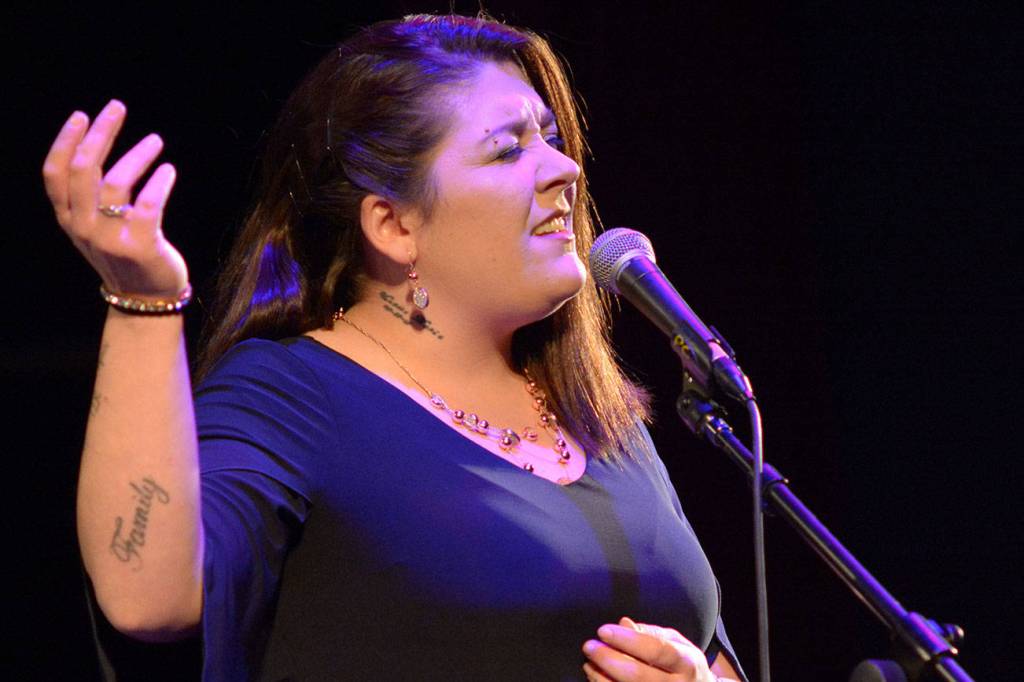 Larisss Birchfield croons “Keep Love On,” an original, for third place at the 2020 Peninsula’s Got Talent Show on Feb. 7. Photo courtesy of Peninsula College