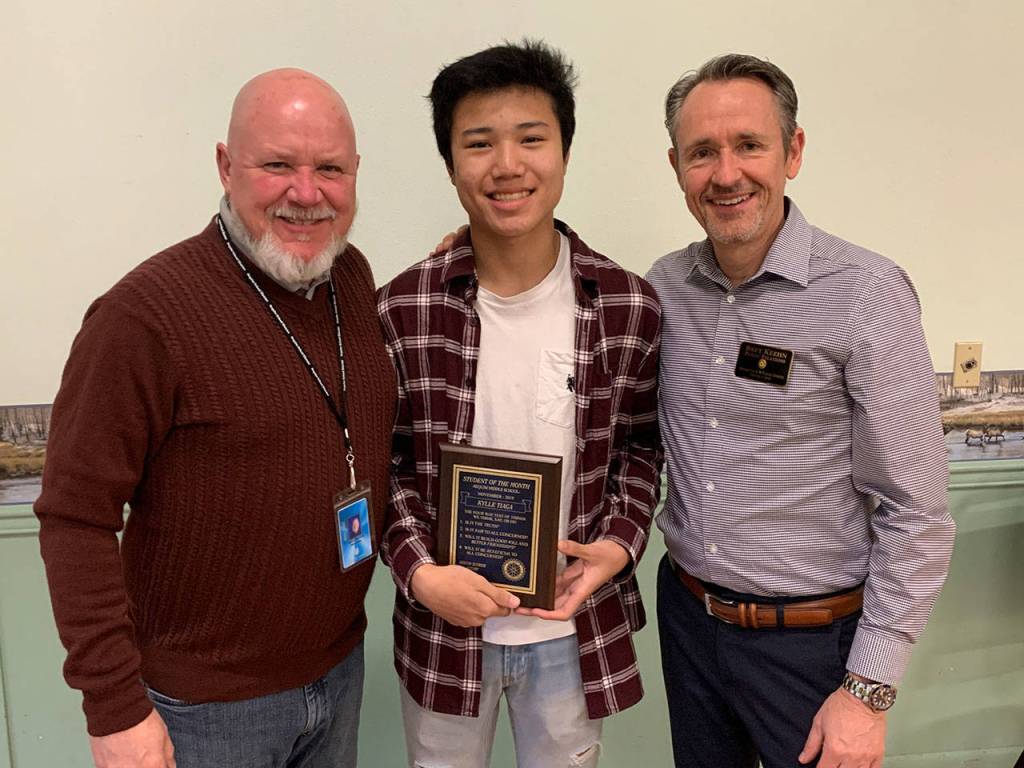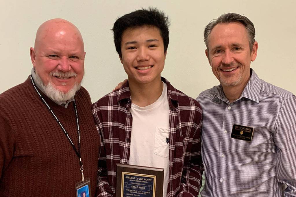 Kylle Tiaga, pictured here with shown here with Sequim Middle School, principal Mark Harris, left, and Bret Keehn, Sequim Sunrise Rotary public relations representative, was named Sequim Sunrise Rotary’s November Middle School Student of the Month.