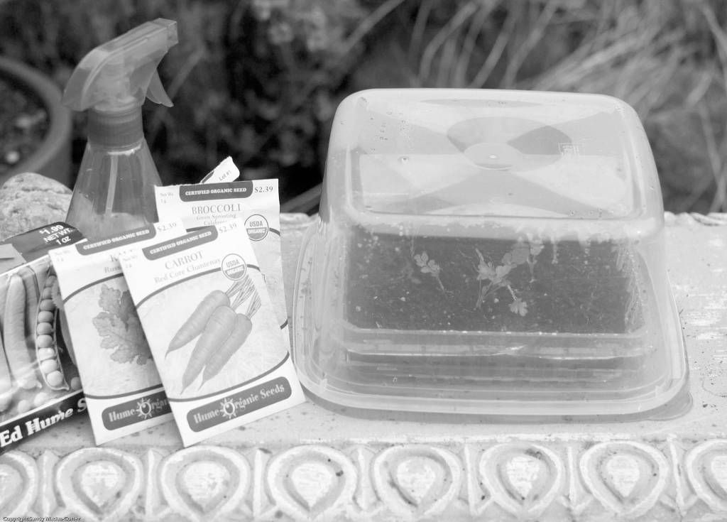 Supplies needed to grow microgreens: Seeds, potting soil, shallow plastic trays with drainage holes (such as recycled clam shells in which fresh berries are sold), a bottom tray that can hold water, a plastic dome/plastic wrap to cover growing trays during germination, and a spray bottle of water.