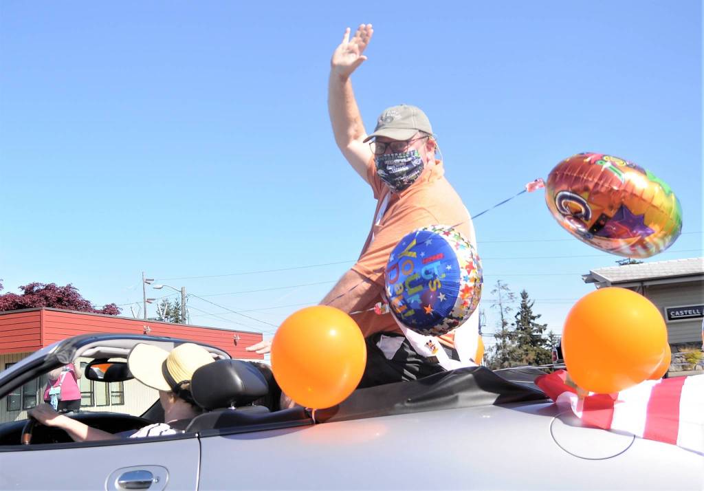 Phil Castell, the 2020 Irrigation Festival Grand Parade marshal, waves to a small gathering on what would have been the festival’s parade day on May 9. With the festival postponed until October, Castell hosted the small, one-car parade to mark the original day of the Grand Parade. Sequim Gazette photo by Michael Dashiell