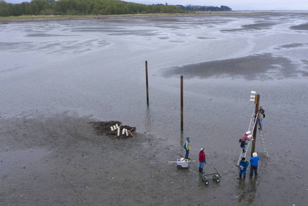 In April 2020, the group — with special authorization from WDFW biologist Shelly Ament — installed 22 PUMA nest boxes on the steel pilings in the tide flats and on root wads around the tidal estuary, and sent seven cleaned and repaired boxes on to protection Island.