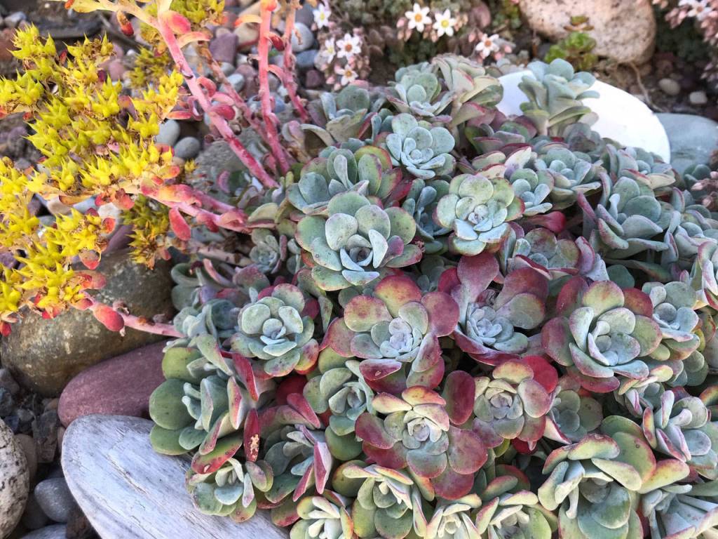 The possibilities go on: a few species of agave and yucca are hardy enough for lower elevations and make a big statement in the succulent garden. A less common plant, Rosularia platyphylla, grows in a dense mat of rosettes and is worth the effort to find, perhaps online.