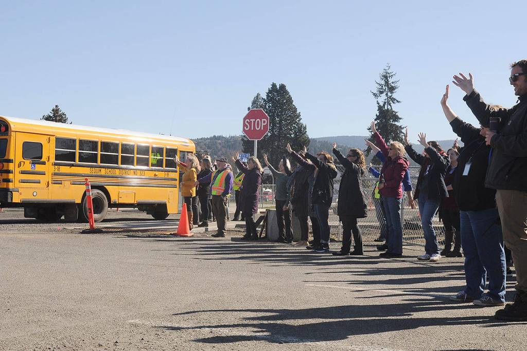 Teachers and staff at Helen Haller Elementary School wave goodbye to students on March 16. Gov. Jay Inslee eventually closed all Washington state schools by executive order. Sequim school leaders are eyeing a phased opening this September. Sequim Gazette file photo by Michael Dashiell