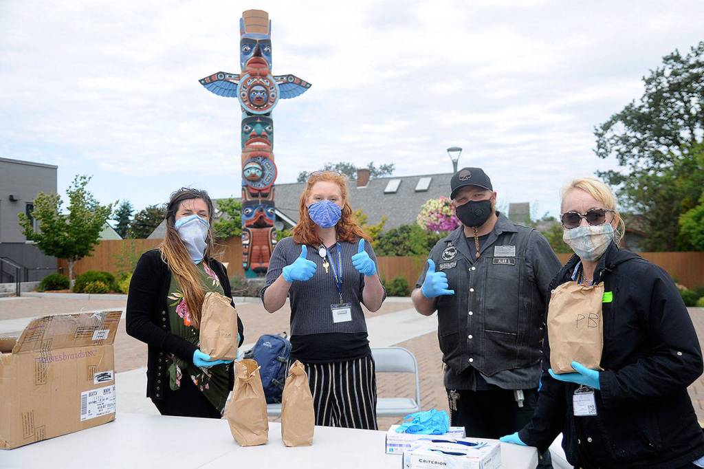 That effort includes staff from Peninsula Behavioral Health and OlyCAP (Olympic Community Action Programs) handing out brown bag lunches and face masks at noon on Thursdays at the Sequim Civic Center Plaza, and eventually a mobile unit, to help connect residents with the services they need most.