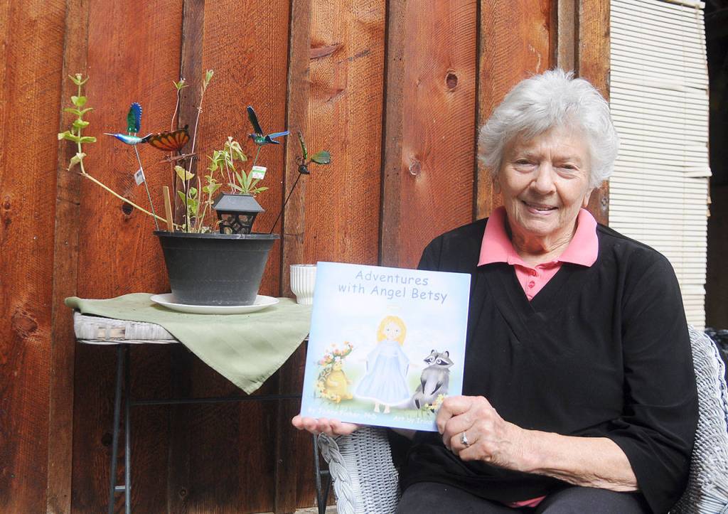 Sequim author JoAnn Fisher displays her first book, “Adventures with Angel Betsy.” Illustrations (at left) are by Ukranian artist Irina Litvin. Sequim Gazette photo by Michael Dashiell