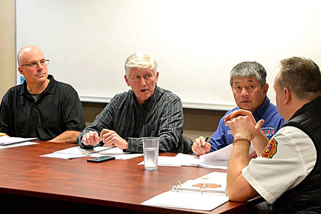 Clallam County Fire District 3 Fire Chief Ben Andrews, right, discusses 2019’s call load with fire commissioners, from left, Bill Miano, Mike Gawley and Steve Chinn on Jan. 7, 2020. Gawley recently announced he wasn’t seeking reelection in 20201. Sequim Gazette photo by Matthew Nash