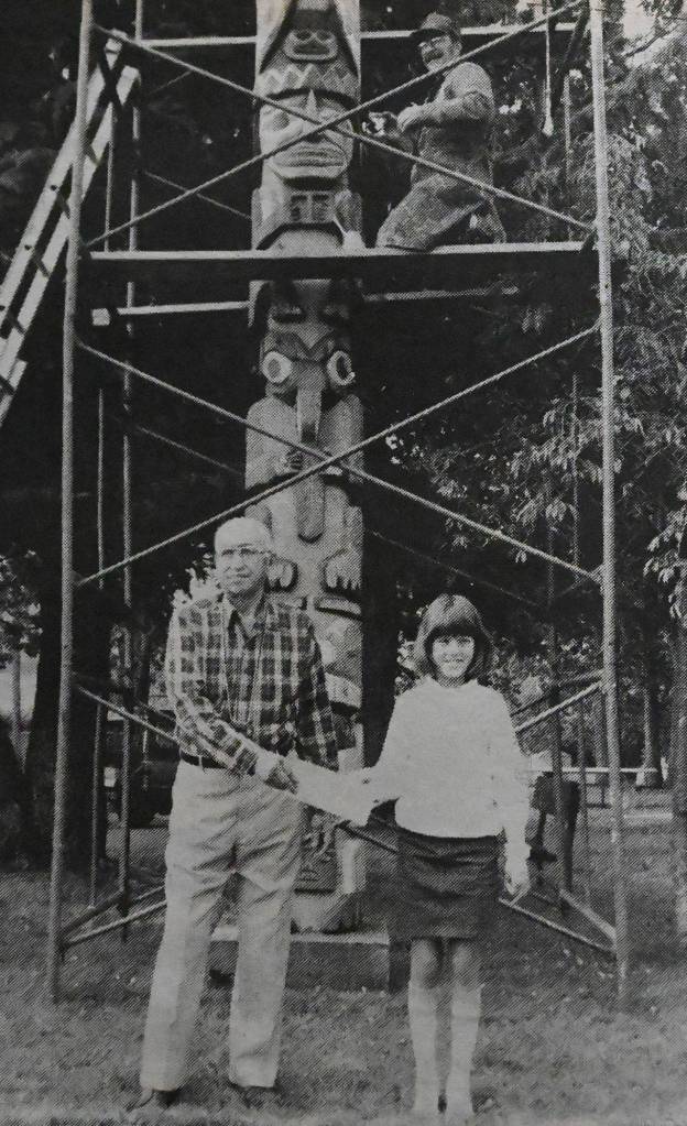 The totem’s history dates back more than 50 years, when Johnson — after an estimated 400 hours of work — gifted the piece to the Sequim Prairie Garden Club during the 74th Irrigation Festival in 1969. Sequim Rotarian Cy Frick was the emcee at its dedication in May of that year.