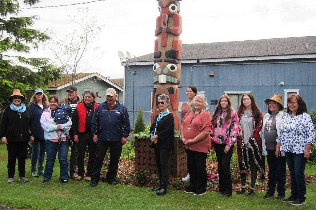 The family of Jamestown S’Klallam Tribal elder Harris “Brick” Johnson celebrate a rededication of his totem at Pioneer Memorial Park on June 5. Family members include, from left, Sandy Johnson, Rosalynn McKenna, Shawna Priest holding Jameson Carver, Josh Carver, Terry Johnson, Steve Johnson, Rosie Zwanziger, Jessica Johnson, Vickie Carroll, Sonni and Jolie Creech, Susan Johnson and Verna Johnson. Photo courtesy of Betty Oppenheimer/Jamestown S’Klallam Tribe