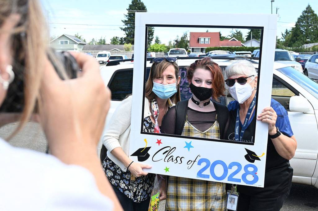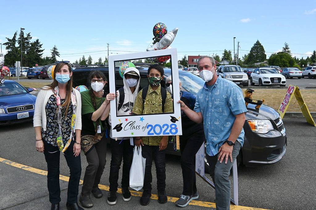 The next day, Helen Haller Elementary, hosted a drive-through for families. School staff cheered as they drove through and each student had an opportunity to take selfies in a special picture frame and with staff, and to receive a special goodie bag from their teachers.