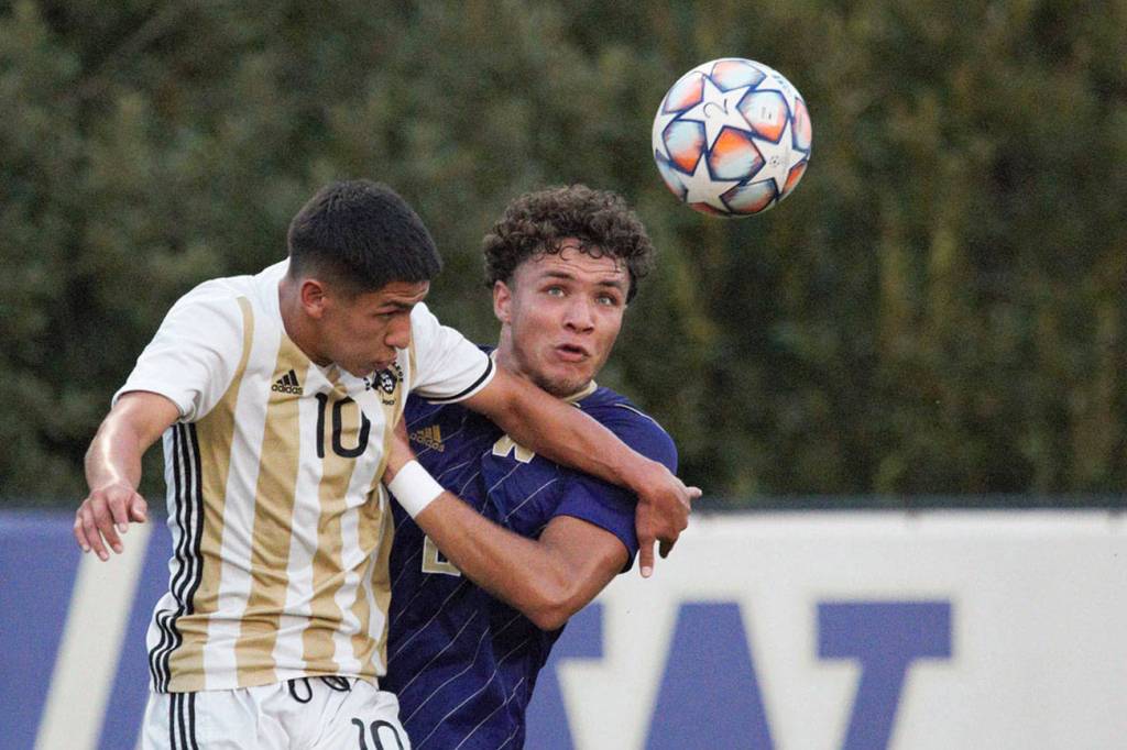 Peninsula College’s Edgar Tavares, left, challenges University of Washington’s Kendall Burks for the ball in an Aug. 15 scrimmage in Seattle. Photo by Rick Ross/Peninsula College