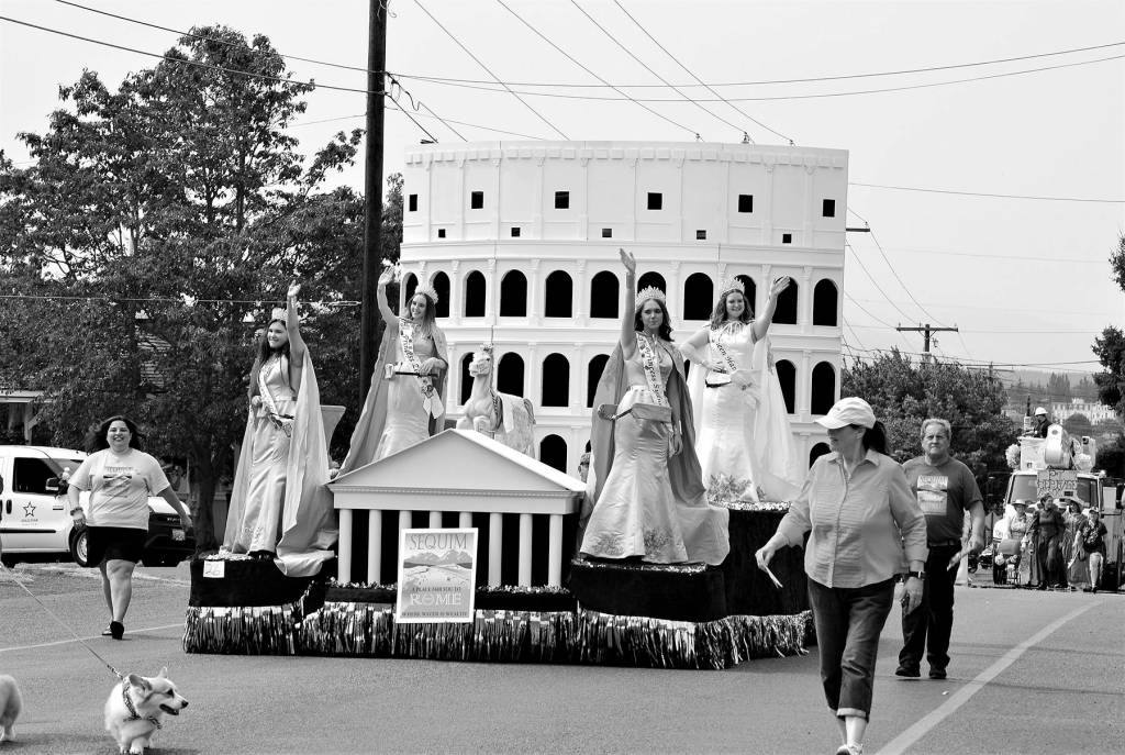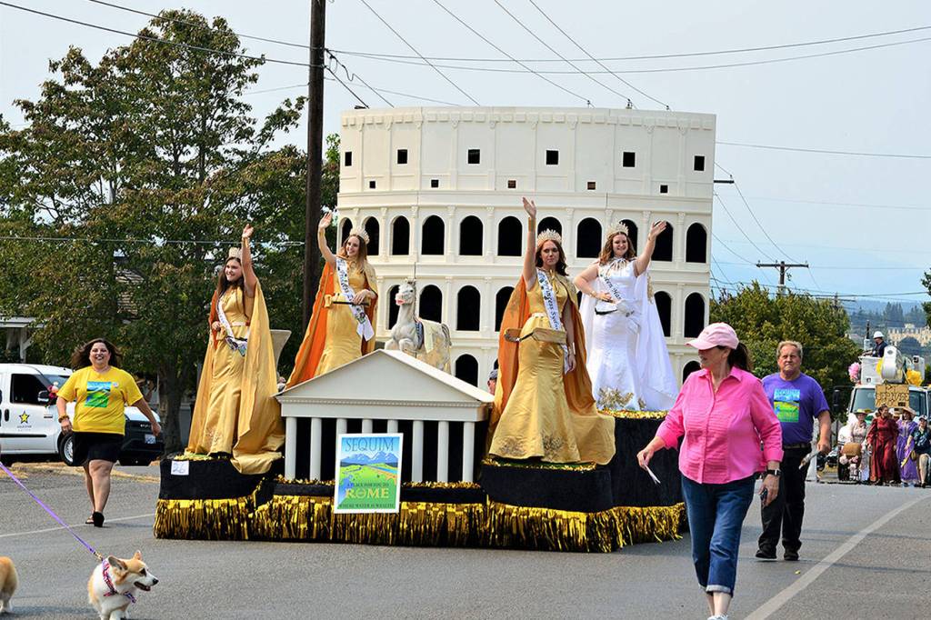 The Sequim Irrigation Festival float, whose theme is “A Place for You to Rome,” rolled through Port Townsend in the 85th annual Rhododendron Festival Grand Parade on Aug. 14. The royalty, from left, are princesses Allie Gale, Zoee Kuperus and Sydney VanProyen and queen Hannah Hampton. Photo by Diane Urbani de la Paz/Olympic Peninsula News Group