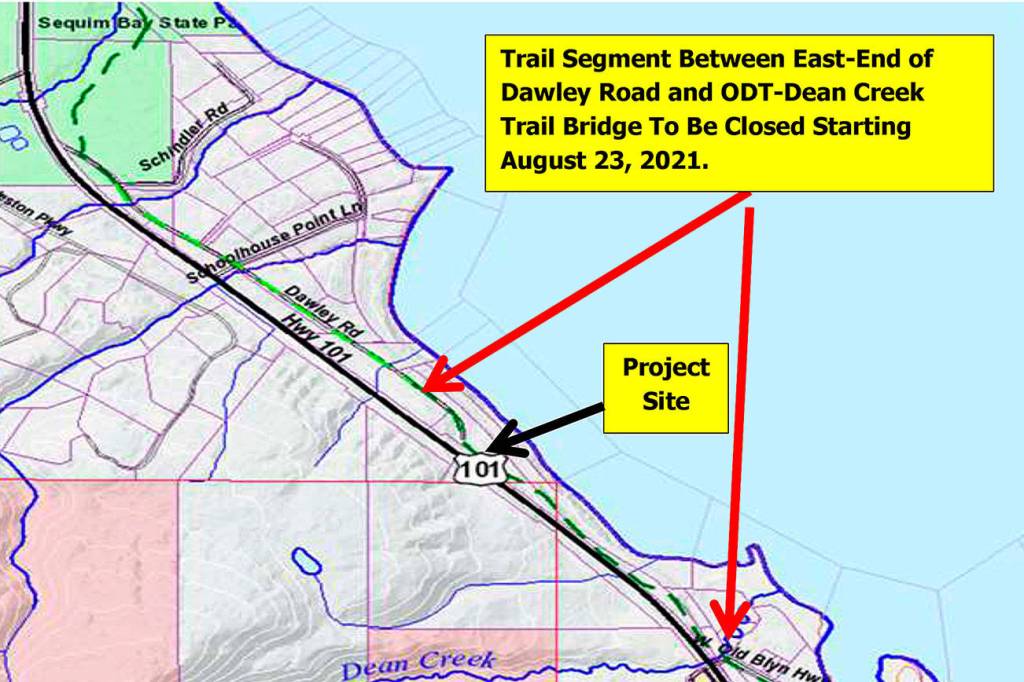 The half-mile trail segment between the east-end of Dawley Road and the Dean Creek Trail Bridge (near West Old Blyn Highway) will be closed to all trail traffic and users to allow for trail repairs and for construction vehicles and equipment access.