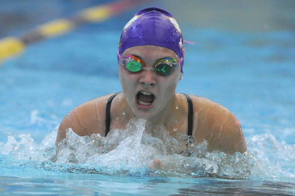 Sequim’s Melanie Byrne swims the breaststroke portion of the Wolves’ 200 medley relay in a Sept. 9 season-opening meet against 3A powerhouse Bainbridge. Sequim Gazette photo by Michael Dashiell