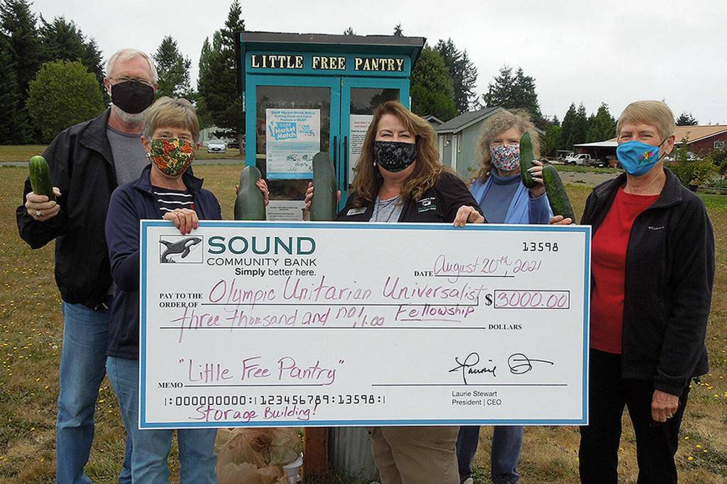 Staff with Sound Community Bank recently presented $3,000 to volunteers with Olympic Unitarian Universalist Fellowship’s Little Free Pantry, 1033 Barr Road, in late August to help with funding a new storage building.