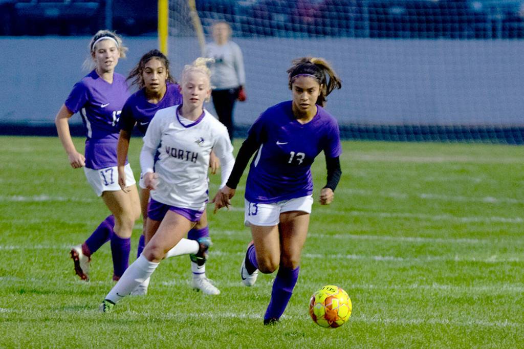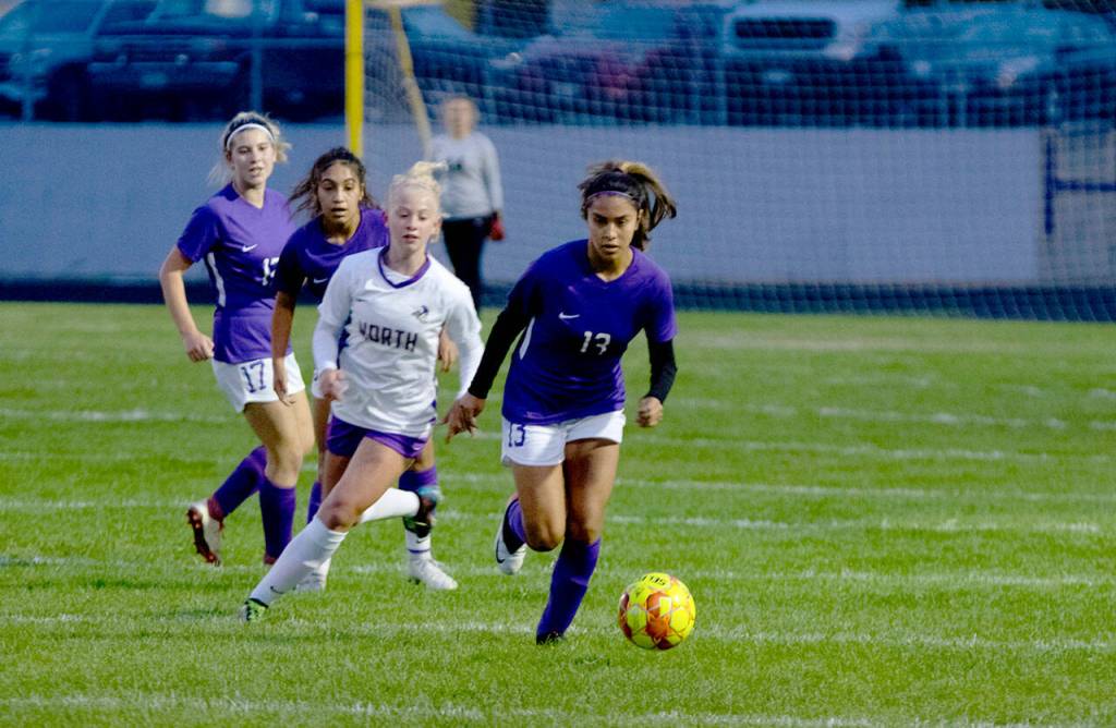 Sequim’s Alexandria Salas advances the ball in the first half of the Wolves’ 2-0 win over visiting North Kitsap on Sept. 16. Sequim Gazette photo by Emily Matthiessen