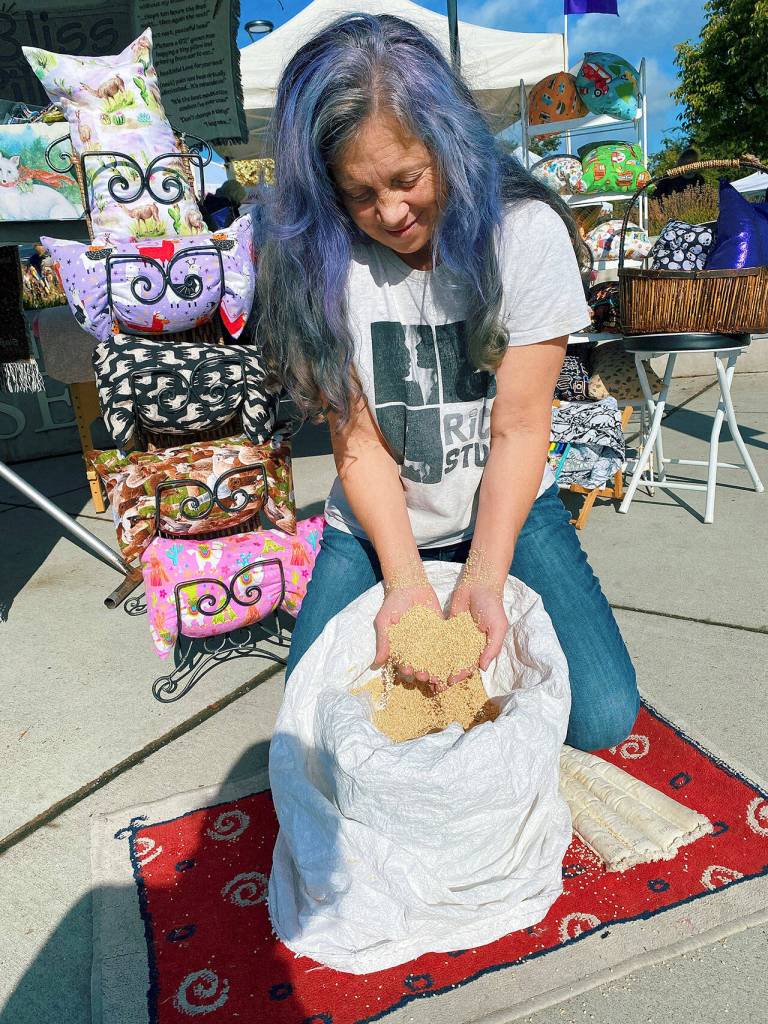 KarenLynnn Robinson shows some of the millet hull filling that goes into a BlissPillow. Photo by Emma Jane “EJ” Garcia