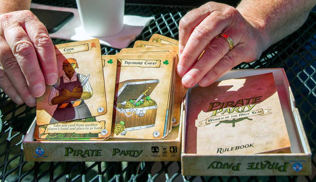 Pirate Party is a card game for two to four players, ages 10 and up, with 65 different cards, and is centered around female pirates from history (see piratepartygame.com). She hired Laura Erwin for the graphic design and illustrations.