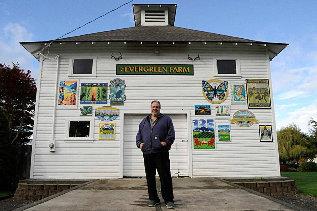Outside the float barn, Guy Horton hangs up this year’s royalty float’s sign. “I thought this year was an amazing float,” he said. It was his 14th and final float, he said as he plans to focus more on work and family- and self-care. Sequim Gazette photo by Matthew Nash