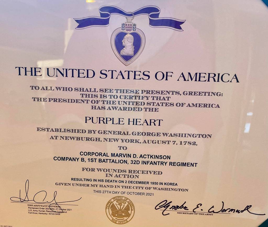 On Thursday, Jan. 20, Actkinson’s sister Linda Featheringill — a Port Angeles resident — will join veteran advocates and groups to honor the soldier’s efforts with a Purple Heart ceremony. Hosted by the Michael Trebert Chapter of the Daughters of the American Revolution, the event is scheduled for 5 p.m. in the Memorial Hall at the Northwest Veterans Resource Center, 216. S. Francis St., Port Angeles. (Masks are required at attend.)