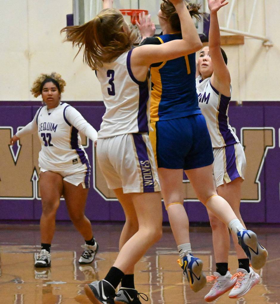 As teammate Jelissa Julmist (32) looks on, Sequim’s Jolene Vaara (3) and Hanna Bates forces Bremerton’s Brooklyn Irvine into a turnover in the second half of Sequim’s 71-46 win on Jan. 20. Sequim Gazette photo by Michael Dashiell