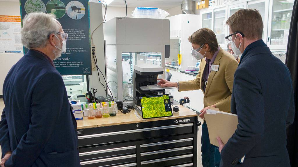 Pacific Northwest National Laboratory research botanist Scott Edmundson shows Congressional Representatives Dan Newhouse and Derek Kilmer how PNNL’s Sequim campus is supporting the U.S. Department of Energy in the development of algae strains that could be well-suited for future sustainable biofuels.