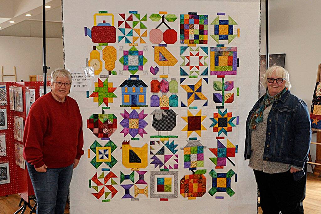 Sequim Gazette photo by Matthew Nash/ Members of the Sunbonnet Sue Quilt Club bring their annual raffle quilt “Down on the Farm” to the Sequim Museum and Arts on April 1 to start promotions for their annual show set for July 16 in Pioneer Memorial Park. Bonnie Filgo, left, pieced the quilt together, and Marianne Nolte, club president, looks to sell out of raffle tickets before the show.