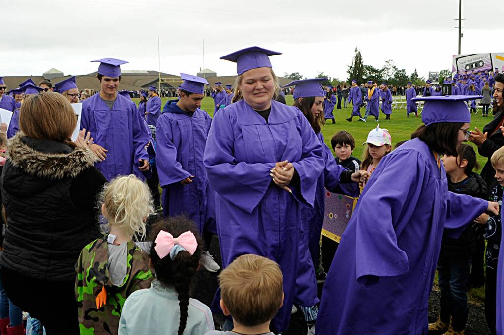 After their morning walk-through for their graduation ceremony on June 10, Sequim High’s approximate 175 graduates were greeted by fellow students and staff from Sequim’s schools with high fives, fist bumps, hugs, cheers and custom signs with each senior’s name.