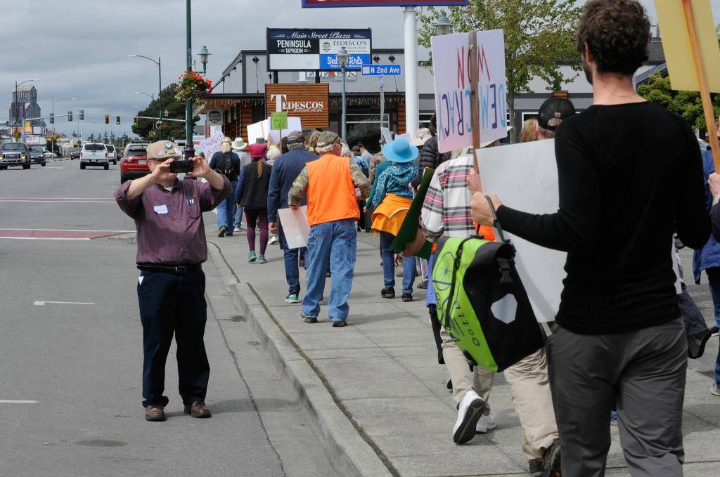 Sequim March co-organizer Tim Wheeler read a statement from Clallam County commissioner Mark Ozias who tested positive for COVID-19 the day prior. He asked, “Who is profiting from the proliferation of guns and gun culture?”