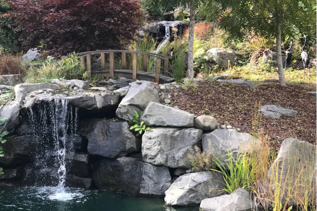 • “A Place to Reflect” located west of Port Angeles, is set back among towering evergreens. The entry drive offers views of several acres of mowed ground on the north side and native growth to the south. The heart of this compact garden is a water feature sporting multiple cascades, dropping some 20-odd feet into a pond of about 80,000 gallons where colorful fishes make a home.