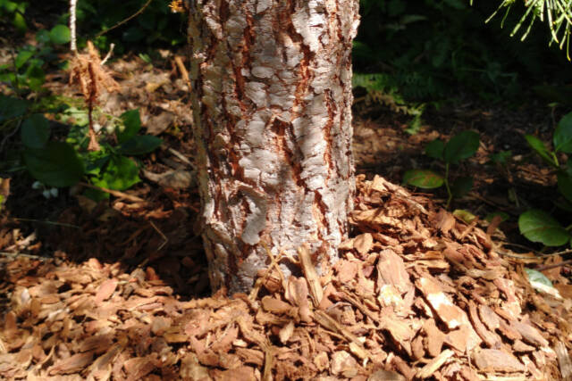 • Do not pile up mulch at the base of a tree or bush. This is sometimes called a “mulch volcano” (see photo). When mulch is in direct contact with plant material or the bark of a tree it creates the perfect conditions for wood rot or the invasion of pests.