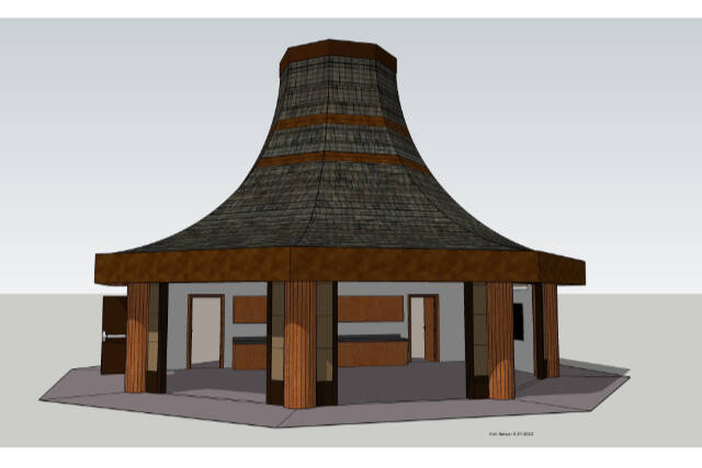 Rooted in Coast Salish design, the new classroom’s shingled round roof will resemble a traditional “potlatch” hat. These hats, center representatives said, are woven from cedar strips and worn by the person hosting a potlatch; the hat is added to in height for each potlatch hosted.