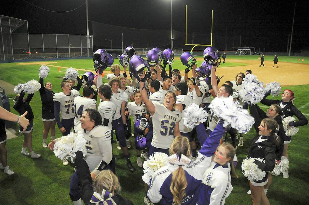 Members of the Sequim Wolves football team and cheer squad celebrate Friday night's 36-32 come-from-behind victory over the Port Angeles Roughriders at Port Angeles Civic Field.