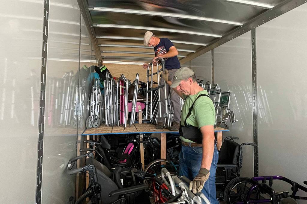 She and about 24 fellow volunteers with Dungeness Community Church loaded wheelchairs, walkers and more into a tractor-trailer at All-Safe Mini Storage.
