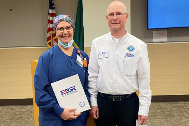 Sarah Winfield, manager of surgical services at Olympic Medical Center, was presented with the Patriot Award at the Board of Commissioners meeting on Nov. 2.