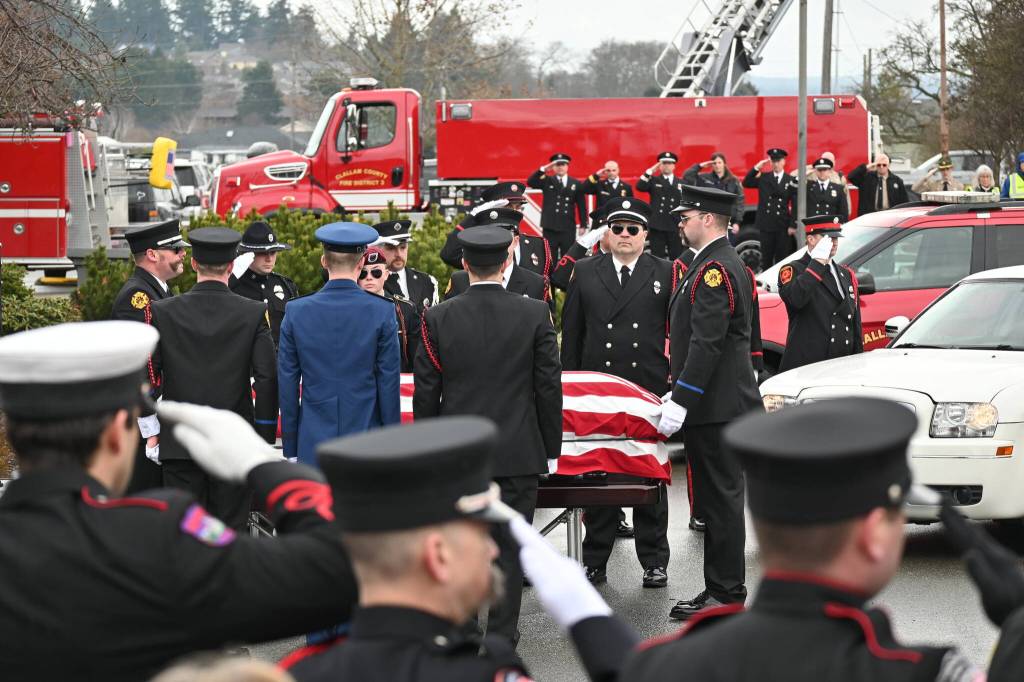 Prior to the memorial service on Saturday, a procession with more than 70 first responder vehicles went through the City of Sequim accompanying Cate’s casket placed above Fire District 3’s antique fire truck. After the service, he was buried at Sequim View Cemetery.