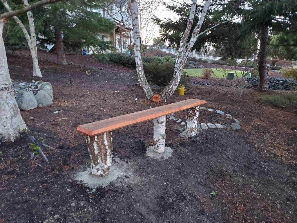 We now have another bench placed which we situated close to the road and in a space that people could stop and rest. Three posts that hold the bench seat are made from that errant trunk of the Birch tree that was threatening to pull the whole tree over.