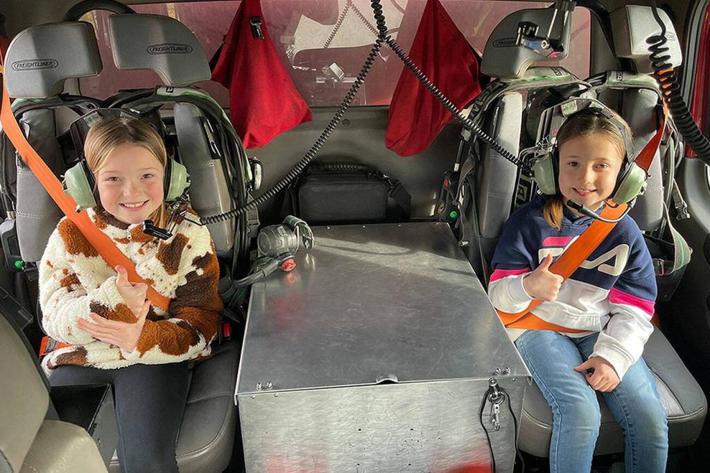 For her efforts to help Helen Haller Elementary School’s Earth Day Fun Run last spring, Ava Schoessler, 8, pictured on right, earned a special trip on Feb. 2 in a fire truck with her mom Tonya, and friend Tessa Thompson, 8.