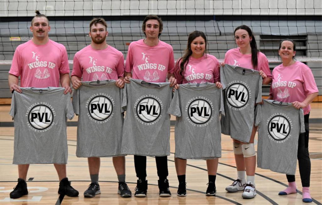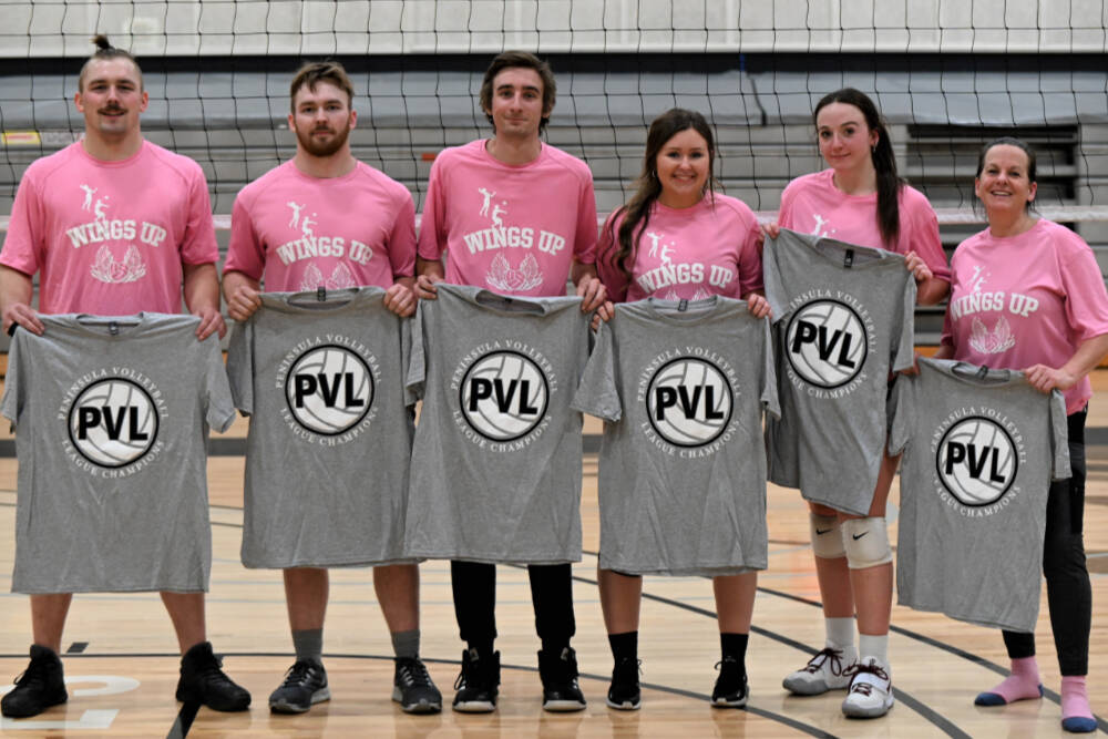 Wings Up of Sequim fought off a serious challenge by Elwha Food and Fuel to capture the Peninsula Volleyball League’s B Division championship on Jan. 31 at the Peninsula College gym.